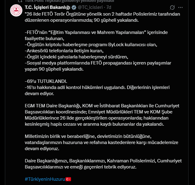 “Emniyet Genel Müdürlüğü Terörle Mücadele Daire Başkanlığı, Kaçakçılık ve Organize Suçlarla Mücadele Başkanlığı ile İstihbarat Başkanlığı ve Cumhuriyet Başsavcılıkları koordinesinde; İl Emniyet Müdürlükleri TEM ve KOM Şube Müdürlüklerince FETÖ Terör Örgütüne yönelik operasyonlar düzenlendi.