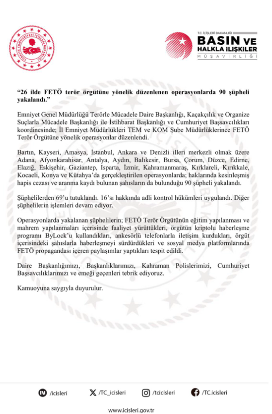 Bartın, Kayseri, Amasya, İstanbul, Ankara ve Denizli illeri merkezli olmak üzere Adana, Afyonkarahisar, Antalya, Aydın, Balıkesir, Bursa, Çorum, Düzce, Edirne, Elazığ, Eskişehir, Gaziantep, Isparta, İzmir, Kahramanmaraş, Kırklareli, Kırıkkale, Kocaeli, Konya ve Kütahya’da gerçekleştirilen operasyonlarda; haklarında kesinleşmiş hapis cezası ve aranma kaydı bulunan şahısların da bulunduğu 90 şüpheli yakalandı. Şüphelilerden 69’u tutuklandı. 16’sı hakkında adli kontrol hükümleri uygulandı. Diğer şüphelilerin işlemleri devam ediyor.