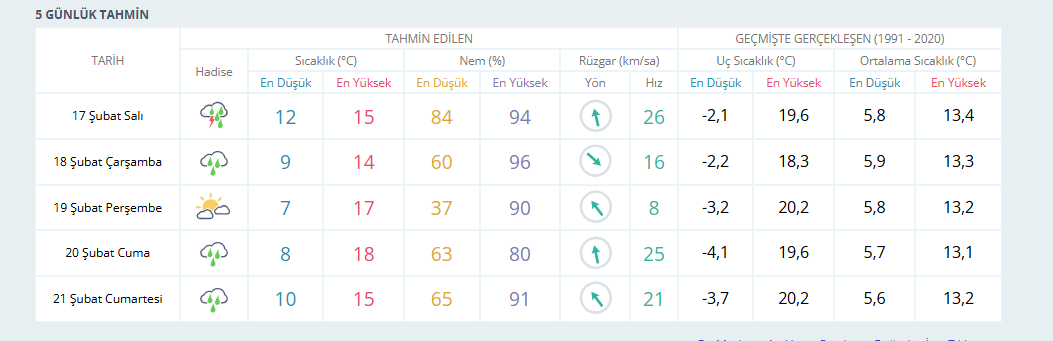 İzmir için yapılan tahminlerde 17 Şubat Salı günü gök gürültülü sağanak yağışın etkili olacağı bildiriliyor. Gün içinde hava sıcaklığının yaklaşık 15 derece civarında olması bekleniyor. Haftanın ortasında da yağışların etkisini devam ettireceği öngörülmekte. 18 Şubat Çarşamba günü sağanak yağışla birlikte sıcaklığın 14 dereceye düşmesi beklenirken, 19 Şubat Perşembe günü parçalı bulutlu bir hava ve 17 derece civarında sıcaklık tahmin ediliyor. 20 Şubat Cuma günü sağanak yağışların yeniden etkili olacağı ve sıcaklığın 18 dereceye yükselebileceği öngörülüyor. 21 Şubat Cumartesi günü ise sağanak yağışlı havayla birlikte sıcaklığın 15 derece civarında seyretmesi bekleniyor.