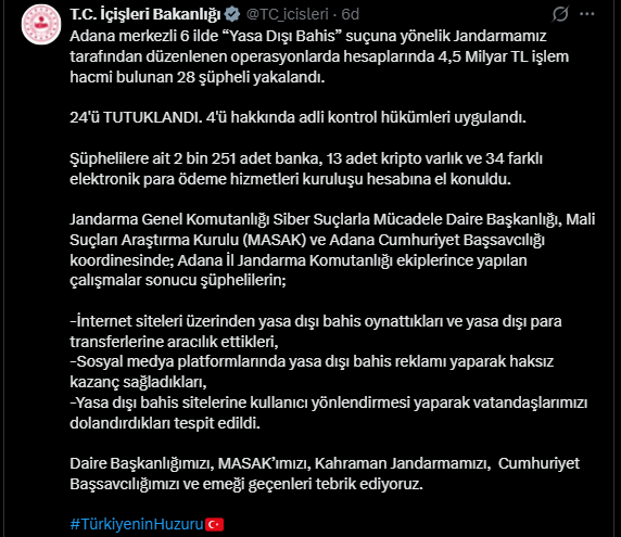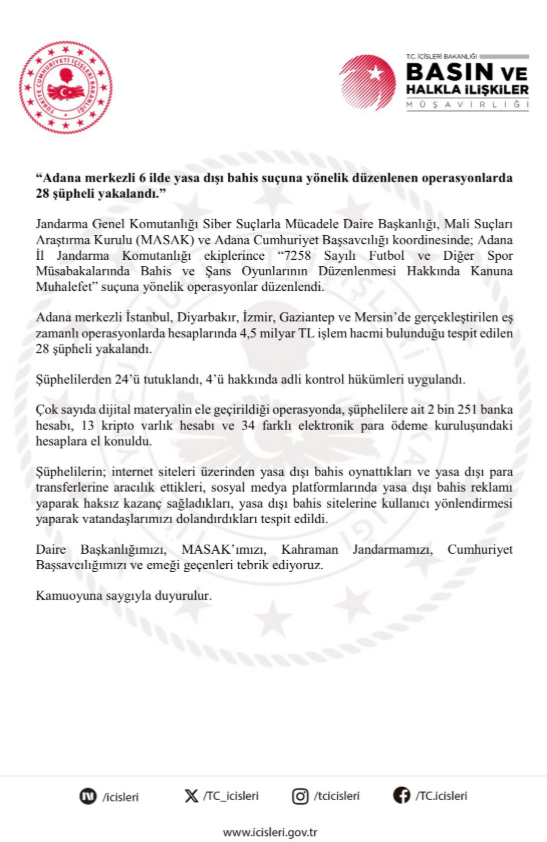 İçişleri Bakanlığı, Adana merkezli İzmir dahil 6 ilde yasa dışı bahis suçuna yönelik jandarma operasyonlarında toplam 28 şüphelinin yakalandığını ve 24’ünün tutuklandığını açıkladı. Operasyonda, şüphelilere ait hesaplarda 4,5 milyar TL’lik işlem hacmi bulunduğu belirlendi.