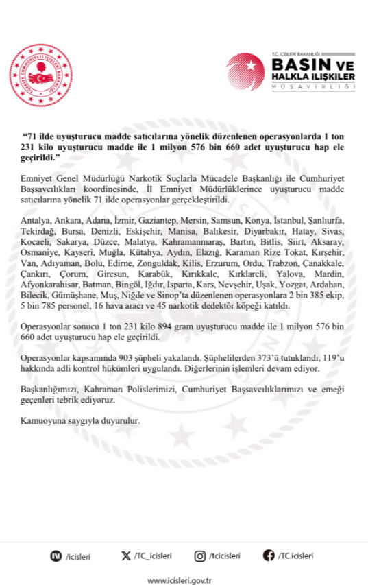 “71 ilde “Uyuşturucu Madde Satıcılarına” yönelik Polisimiz tarafından son 1 haftadır düzenlenen operasyonlarımızda; -1 ton 231 kg Uyuşturucu Madde ile -1 milyon 576 bin 660 adet Uyuşturucu Hap ele geçirildi. -903 şüpheli yakalandı.