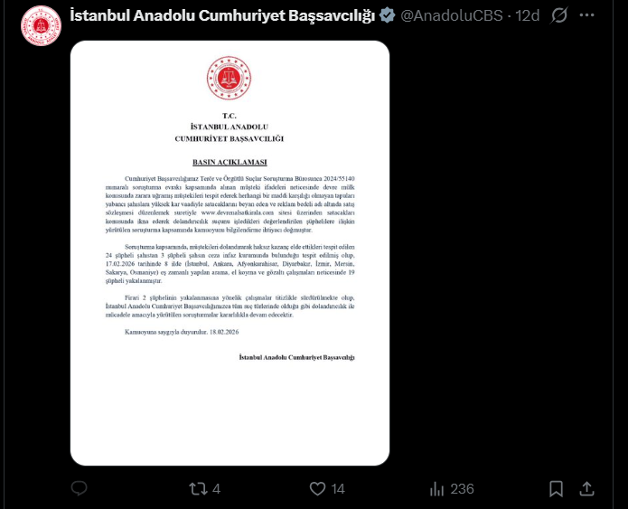 “Cumhuriyet Başsavcılığımız Terör ve Örgütlü Suçlar Soruşturma Bürosu tarafından 2024/55140 numaralı soruşturma kapsamında alınan müşteki ifadeleri neticesinde devre mülk konusunda zarara uğramış mağdurlar tespit edilmiş ve herhangi bir maddi karşılığı olmayan tapuları yüksek kar vaadiyle yabancı şahıslara satacağı yönünde beyanlarda bulunan şüphelilerin dolandırıcılık suçunu işlediği değerlendirilmiştir. 17.02.2026 tarihinde beş ilde eş zamanlı yapılan arama ve gözaltı işlemleri sonucunda 19 şüpheli yakalanmış olup, firari 2 şüphelinin yakalanmasına yönelik çalışmalar devam etmektedir. İstanbul Anadolu Cumhuriyet Başsavcılığı, dolandırıcılıkla mücadele amacıyla yürütülen tüm soruşturmaları kararlılıkla sürdürecektir.”
