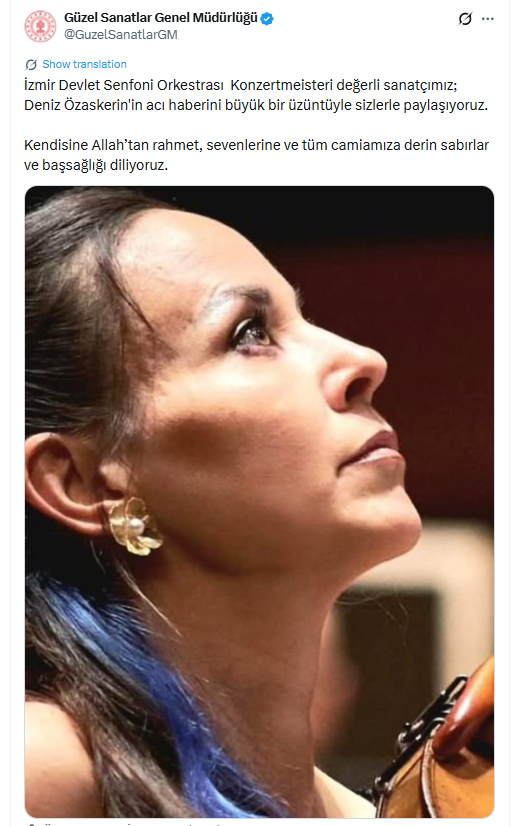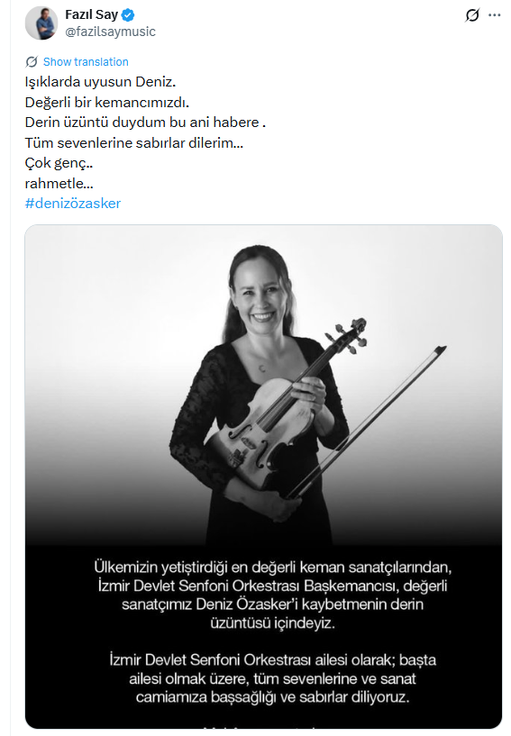 Kültür ve Turizm Bakanlığı Güzel Sanatlar Genel Müdürlüğü, yaptığı açıklamada “İzmir Devlet Senfoni Orkestrası başkemancısı değerli sanatçımız Deniz Özasker’in acı haberini büyük bir üzüntüyle sizlerle paylaşıyoruz. Kendisine Allah’tan rahmet, sevenlerine ve tüm camiamıza derin sabırlar ve başsağlığı diliyoruz.” dedi.