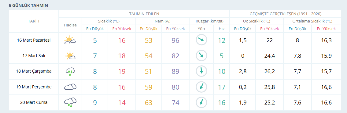 Meteoroloji verilerine göre İzmir'de 16 Mart Pazartesi günü termometrelerin 16 dereceyi göstermesi bekleniyor. 17 Mart Salı günü ise termometrelerin 18 dereceye yükselmesi beklenirken parçalı bulutlu bir gökyüzü öngörülüyor. 18 Mart Çarşamba günü ise İzmir'de yağışlı bir hava bekleniyor. O gün termometreler 19 derecelerde seyredecek. 19 Mart Perşembe günü ise bulutlu bir gökyüzü beklenirken termometrelerin 16 derecelere inmesi bekleniyor. 20 Mart tarihinde ise yağışlı bir hava beklenirken termometrelerin 14 dereceye düşmesi öngörülüyor.