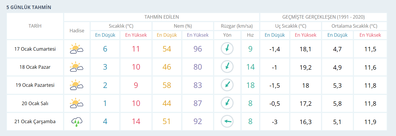 17 Ocak Cumartesi günü şehir genelinde sıcaklığın 11 derece civarında olması beklenirken, 18 Ocak Pazar günü bu değerin 10 dereceye düşeceği tahmin ediliyor.