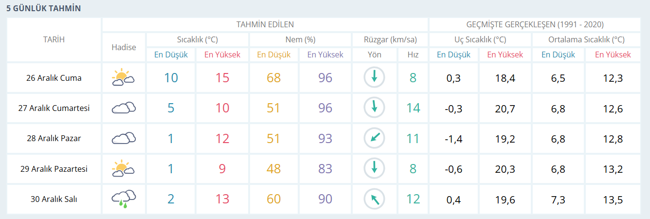 Meteorolojik tahminlere göre 29 Aralık Pazartesi günü İzmir'deki hava sıcaklığı 9 dereceye inecek. Bu günde parçalı bulutlu bir hava bekleniyor. 30 Aralık Salı günü ise hava sıcaklığının 13 dereceye çıkacağı ve şehir genelinde sağanak yağış olduğu öngörülüyor.