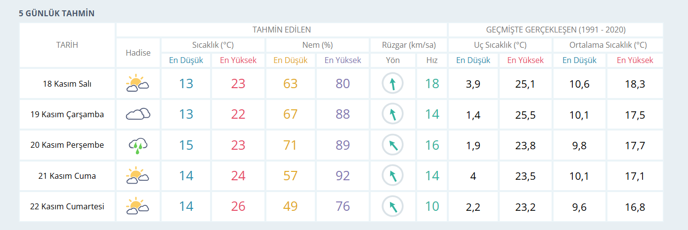 Haftanın ilerleyen günlerinde hava koşullarında önemli değişiklikler gözlemleniyor. 19 Kasım Çarşamba günü bulutlu hava ve 22 derece sıcaklık bekleniyor. 20 Kasım Perşembe günü ise sağanak yağışla karşılaşılması öngörülüyor; bu günün sıcaklığı 23 derece olacak. 21 Kasım Cuma günü hava tekrar parçalı bulutlu hale gelecek ve sıcaklık 24 dereceye yükselecek.