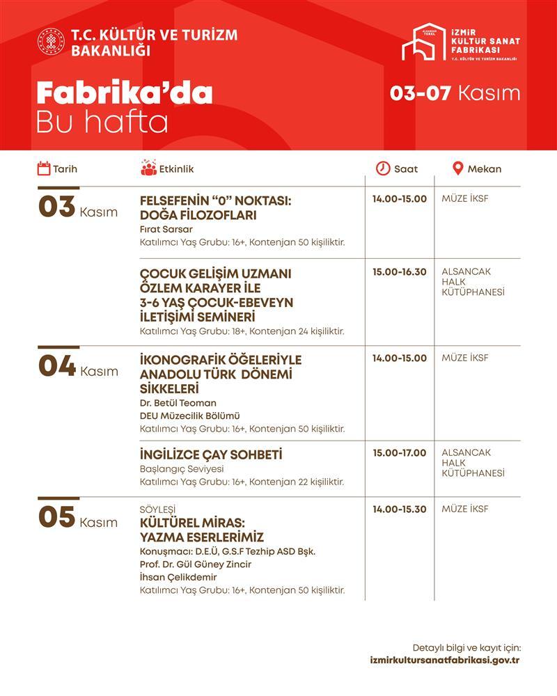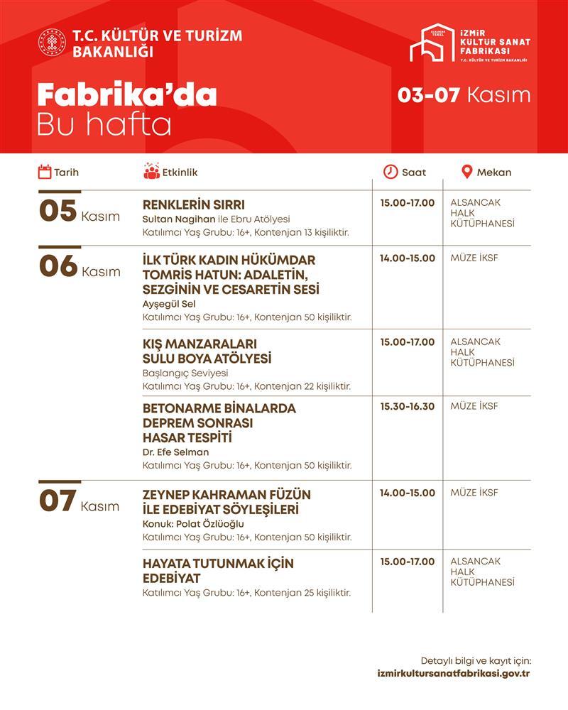3-7 Kasım tarihleri arasında çeşitli özel etkinliklerin düzenleneceği İzmir Kültür Sanat Fabrikası’nda, uzmanlarla birlikte seminerler, atölye çalışmaları ve söyleşiler gerçekleştirilecek.