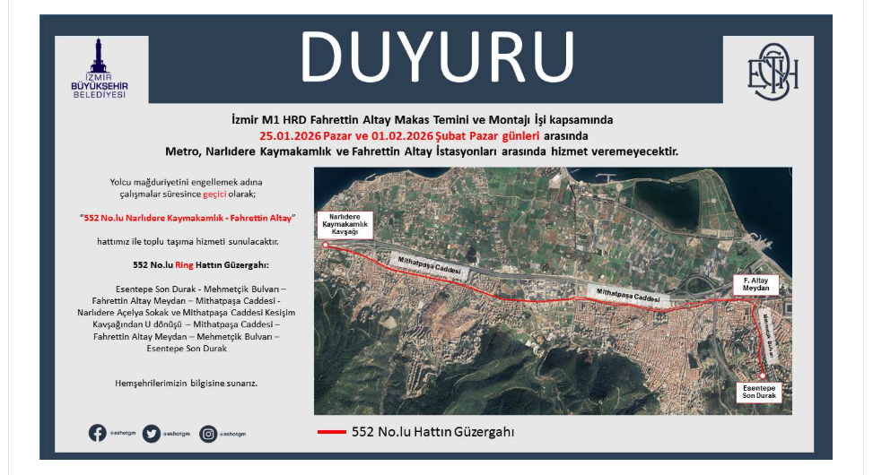 ESHOT’un sağladığı bilgilere göre ring hattı, Esentepe Son Durak'tan başlayarak Mehmetçik Bulvarı, Fahrettin Altay Meydanı, Mithatpaşa Caddesi, Narlıdere Açelya Sokak ve Mithatpaşa Caddesi kesişim kavşağından U dönüşü yaparak aynı güzergah üzerinden Esentepe Son Durak’a ulaşacak. ESHOT Genel Müdürlüğü'nün açıklamasında şu ifadeler yer aldı: “İzmir M1 HRD Fahrettin Altay Makas Temini ve Montajı İşi kapsamında 25.01.2026 Pazar ve 01.02.2026 Şubat Pazar günleri arasında Metro, Narlıdere Kaymakamlık ve Fahrettin Altay İstasyonları arasında hizmet veremeyecektir. Yolcu mağduriyetini engellemek adına çalışmalar süresince geçici olarak; “552 No.lu Narlıdere Kaymakamlık-Fahrettin Altay hattımız ile toplu taşıma hizmeti sunulacaktır.”