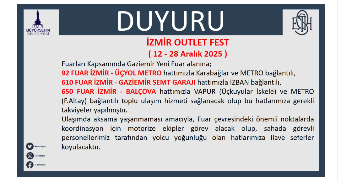 İzmir Outlet Fest, 12–28 Aralık 2025 tarihleri arasında Gaziemir Yeni Fuar Alanı'nda gerçekleştirilecek. Festival süresince ulaşımın aksamaması için ESHOT Genel Müdürlüğü'nün planlamaları uygulamaya konulacak.