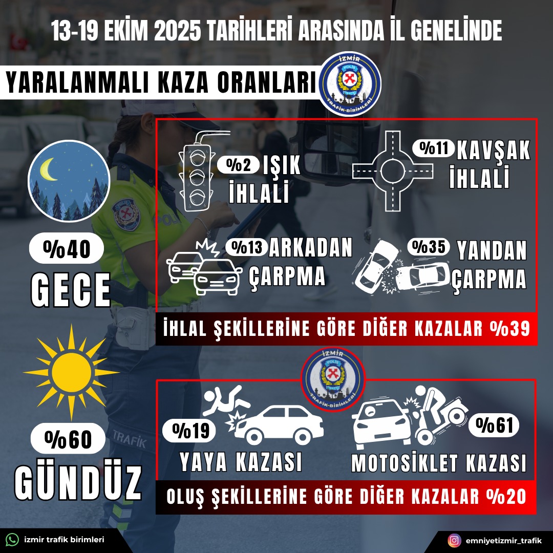 İzmir Trafik Birimleri'nin bu haftaki verilerine göre, kentin trafik kazalarının %61'i motosiklet kazalarından meydana geliyor. Bu kazaların çoğu gündüz saatlerinde görülürken, gece kazalarının oranı %40 olarak kaydedildi.