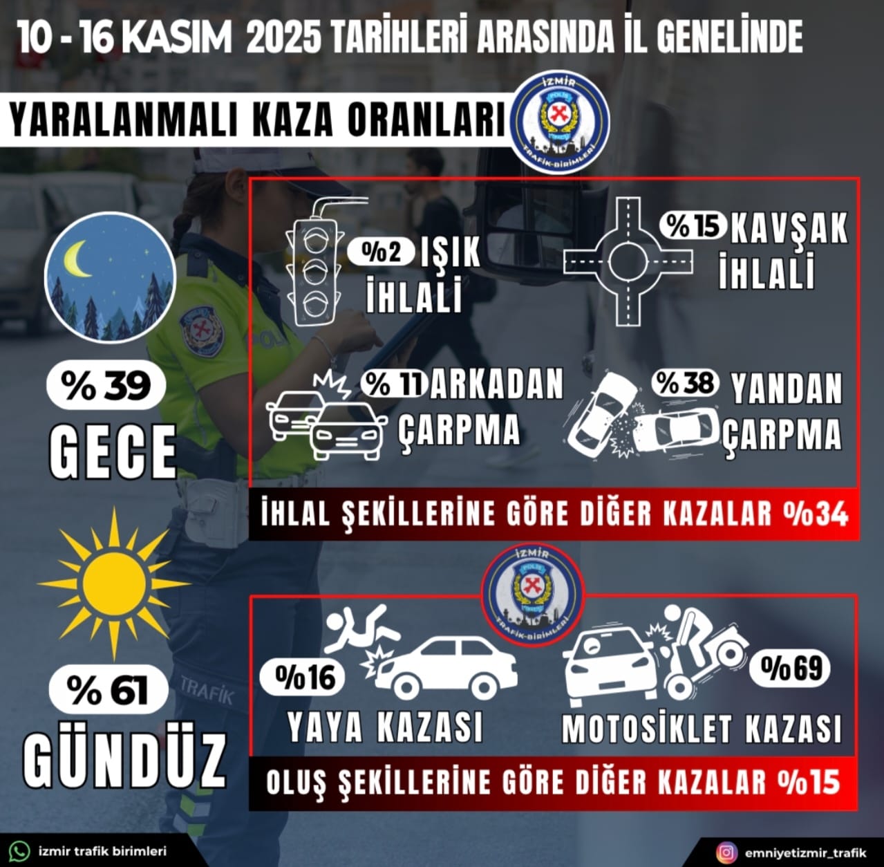 Hız ihlalleri İzmir'de artış göstermeye devam ediyor. Bu hafta hız cezası sayısı 6 bin 578’e ulaşarak yüksek bir rakam oluşturdu. İzmir'deki trafik kazalarının %69'u motosiklet kazalarından kaynaklanmakta. Kazaların büyük bir kısmı gündüz saatlerinde gerçekleşirken, gece kazalarının oranı %39 olarak belirlendi.
