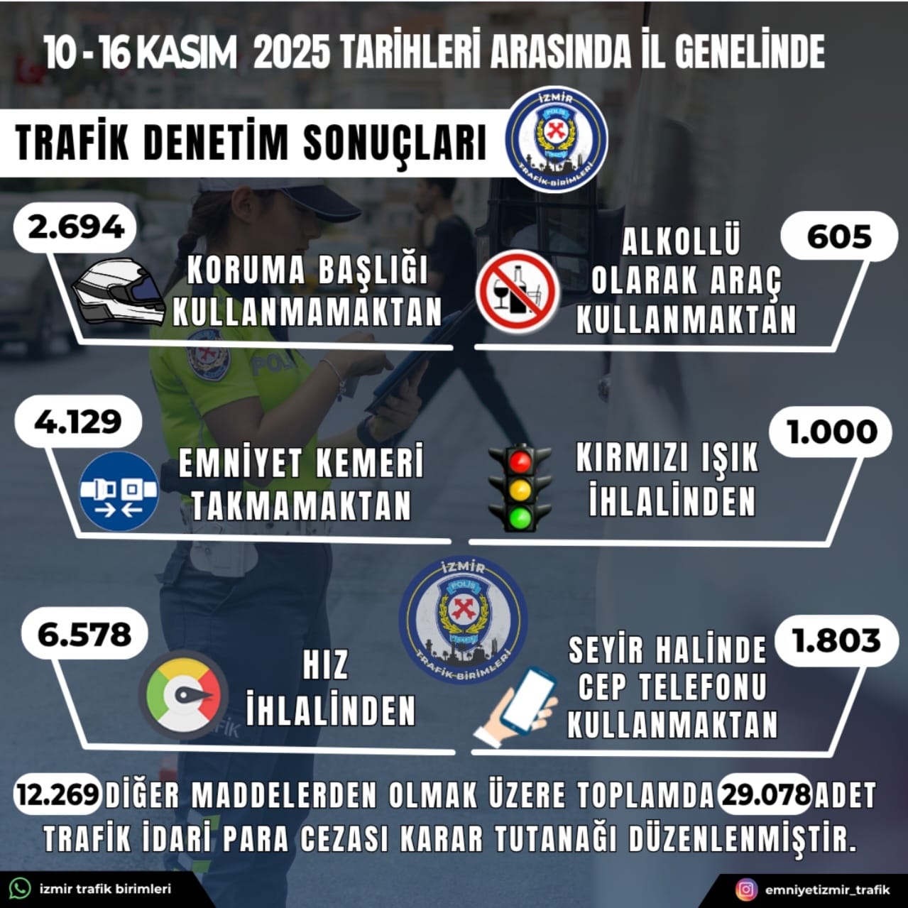 İzmir Trafik Birimleri tarafından yayımlanan rapora göre, bu haftaki denetimlerde toplamda 29 bin 78 sürücüye ceza uygulandı. Öne çıkan ihlaller arasında emniyet kemeri kullanmama, kasksız motosiklet sürme, hız sınırlarını aşma ve araç kullanırken cep telefonu kullanımı dikkat çekti. Emniyet kemeri takmayan sürücü sayısı bu hafta 4 bin 129 olarak kaydedildi.