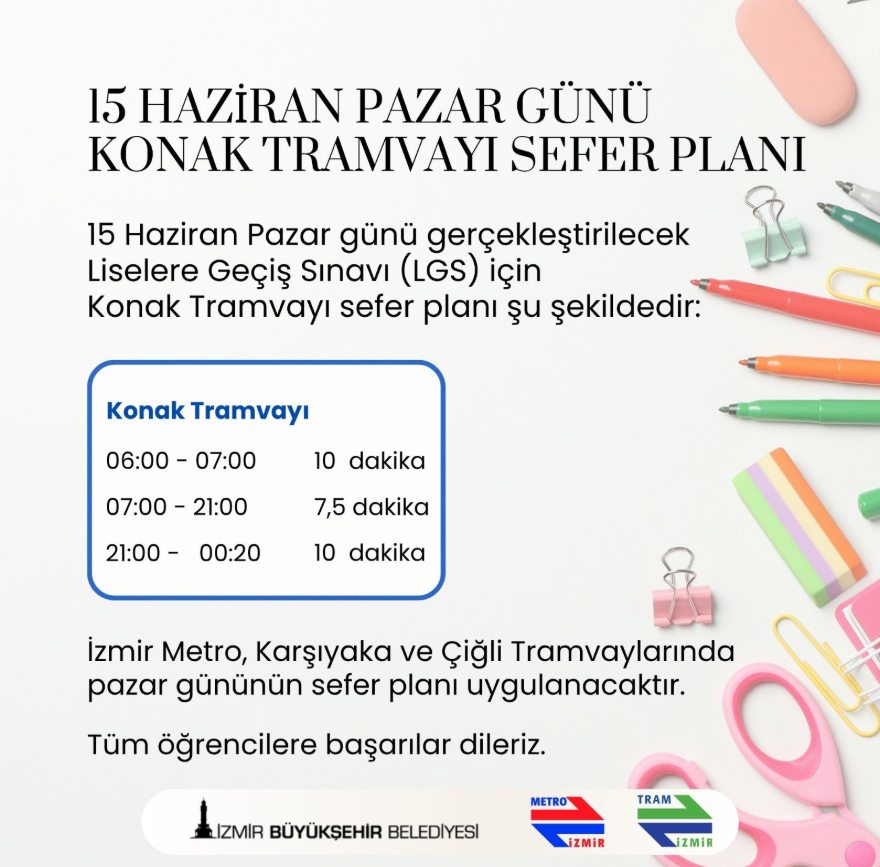 İzmir’de toplu ulaşımın önemli unsurlarından biri olan Konak Tramvayı, 15 Haziran Pazar günü gerçekleştirilecek Liselere Geçiş Sınavı (LGS) dolayısıyla öğrencilere özel sefer düzenlemesi yaptı. İzmir Büyükşehir Belediyesi tarafından yapılan açıklamada, sınav günü için geçerli olacak tramvay sefer saatleri şu şekildedir: