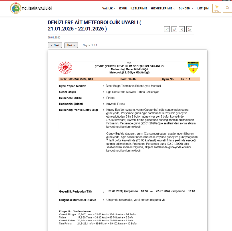 Meteoroloji 2. Bölge Müdürlüğü tarafından yapılan ve İzmir Valiliği tarafından paylaşılan açıklamada şu ifadeler yer aldı: “Kuzey Ege'de rüzgarın, yarın (Çarşamba) öğle saatlerinden sonra güneyinde; Perşembe günü öğle saatlerinde kuzeyinde, güney ve güneydoğudan 6 ila 8 bofor, güneyde yer yer 9 bofor kuvvetinde (75-90 km/saat) güçlü fırtına şeklinde eseceği tahmin edilmektedir. Fırtınanın, Perşembe günü (22.01.2026) öğle saatlerinden sonra etkisini kaybetmesi beklenmektedir.