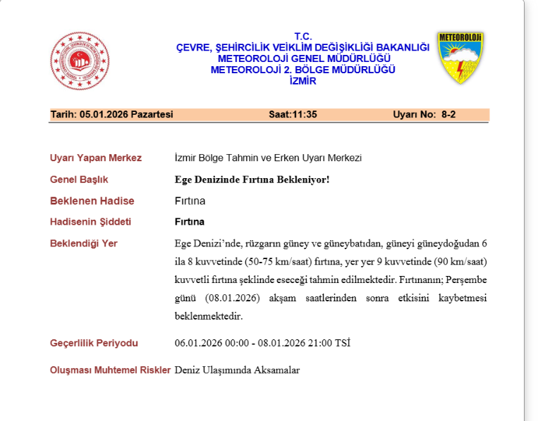 Açıklamada, fırtınanın neden olabileceği ağaç ve direk devrilmesi, çatı uçması ile soba ve doğal gazdan kaynaklanan baca gazı zehirlenmesi risklerine dikkat çekildi. Vatandaşlardan tedbirli olmaları istendi. Beklenen Hadise: Ege Denizinde Fırtına Bekleniyor! Beklendiği Yer: Ege Denizi'nde, rüzgarın güney ve güneybatıdan, güneyin güneydoğusundan 6 ila 8 kuvvetinde (50-75 km/saat) fırtına, yer yer 9 kuvvetinde (90 km/saat) kuvvetli fırtına şeklinde eseceği tahmin edilmektedir. Fırtınanın; Perşembe günü (08.01.2026) akşam saatlerinden sonra etkisini kaybetmesi beklenmektedir. Geçerlilik Periyodu: 06.01.2026 00:00 – 08.01.2026 21:00 TSİ Oluşması Muhtemel Riskler: Deniz Ulaşımında Aksamalar