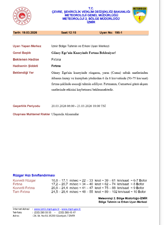 Meteoroloji 2. Bölge Müdürlüğü’ne bağlı İzmir Bölge Tahmin ve Erken Uyarı Merkezi tarafından yapılan açıklamada Güney Ege’nin kuzeyinde rüzgarın bugünden itibaren zaman zaman etkisini artıracağı belirtildi. Açıklamaya göre rüzgarın kuzey ve kuzeybatı yönlerden saatte 50 ila 75 kilometre hızla, 6 ila 8 kuvvetinde fırtına şeklinde eseceği tahmin ediliyor. Yapılan açıklamada fırtınanın Cumartesi günü akşam saatlerine kadar etkisini sürdüreceğini ve ardından zayıflayarak etkisini kaybedeceğini bildirdi.