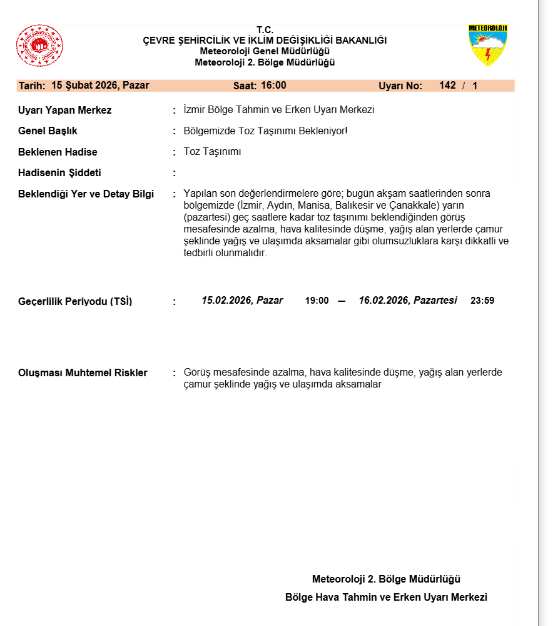 İzmir Valiliği tarafından yapılan açıklamaya göre, bugün akşam saatlerinden itibaren başlayacak olan toz taşınımının, yarın geç saatlere kadar süreceği öngörülüyor. Uyarının geçerlilik süresi 15 Şubat 2026 Pazar günü saat 19.00 ile 16 Şubat 2026 Pazartesi günü saat 23.59 olarak belirtildi.