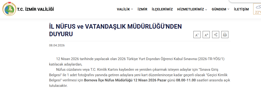 “12 Nisan 2026 tarihinde yapılacak olan 2026 Türkiye Yurt Dışından Öğrenci Kabul Sınavına (2026-TR-YÖS/1) katılacak adaylardan, Nüfus cüzdanını veya T.C. Kimlik Kartını kaybeden ve yeniden çıkarmak isteyen adaylar için “Sınava Giriş Belgesi” ile 1 adet fotoğrafını yanında getiren adaylara yeni kart düzenleninceye kadar geçerli olacak “Geçici Kimlik Belgesi” verilmesi için Bornova İlçe Nüfus Müdürlüğü 12 Nisan 2026 Pazar günü 08.00-11.00 saatleri arasında açık tutulacaktır.”