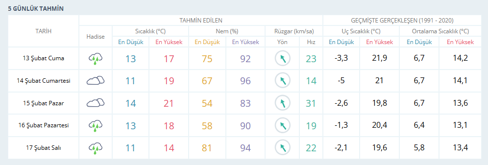 Meteoroloji verilerine göre İzmir’de 13 Şubat Cuma günü hava sıcaklığı yaklaşık 17 derece olacak ve sağanak yağış bekleniyor. 14 Şubat Cumartesi günü yağışların kısa süreli durması öngörülürken, Sevgililer Günü'nde bulutlu bir hava ve 19 derece civarında sıcaklık tahmin ediliyor. 15 Şubat Pazar günü ise sıcaklıkların 21 dereceye kadar çıkması bekleniyor.