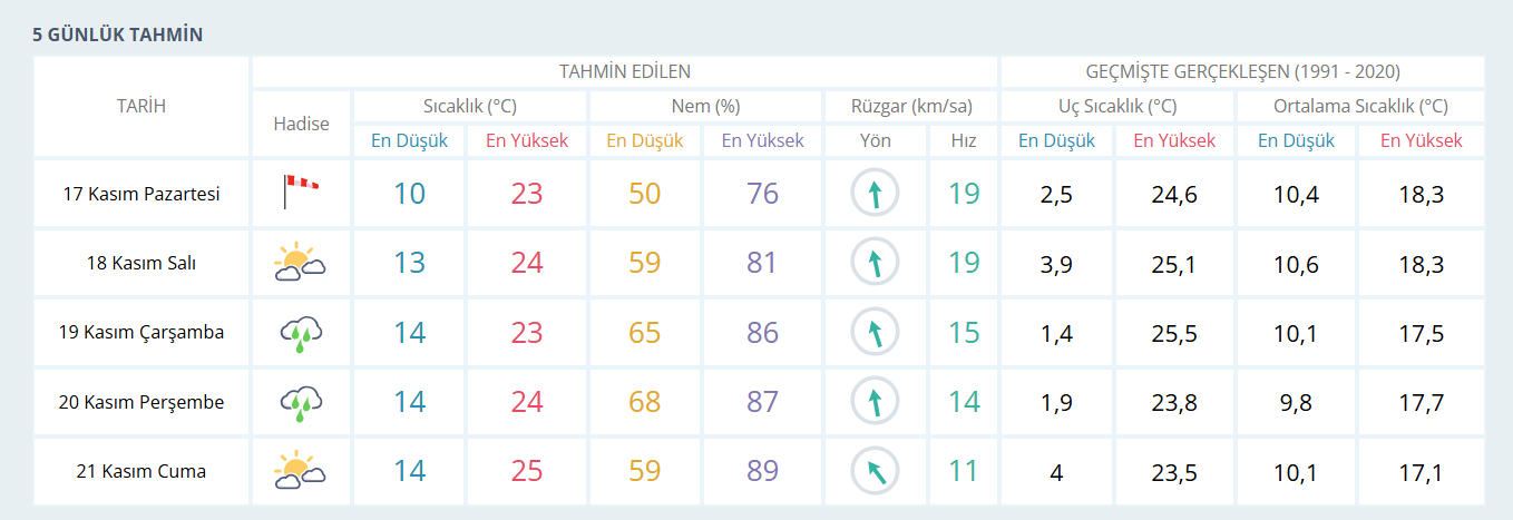 17 Kasım 2025 Pazartesi günü İzmir’de sıcaklık 23 derece civarında olacak ve rüzgarlı bir hava etkisini gösterecek. 18 Kasım Salı günü parçalı bulutlu bir hava ile sıcaklık 24 derece olacak. 19 Kasım Çarşamba ise sağanak yağış bekleniyor ve sıcaklık 23 derece olarak tahmin ediliyor. 20 Kasım Perşembe gününde de sağanak yağışın devam etmesi beklenirken sıcaklık 24 derece olacak. Meteoroloji verilerine göre, 21 Kasım Cuma günü ise hava 25 derece ve parçalı bulutlu olacak.