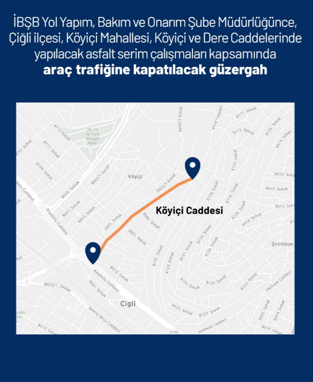 İzmir Büyükşehir Belediyesi Yol Yapım, Bakım ve Onarım Şube Müdürlüğü tarafından gerçekleştirilmekte olan çalışmalar çerçevesinde Çiğli ilçesinin Köyiçi Mahallesi'nde Köyiçi ve Dere Caddeleri'nde asfalt serimi yapılacağı açıklandı. Bu doğrultuda, Köyiçi Caddesi'nin çalışma süresince araç trafiğine tamamen kapatılacağı belirtildi.