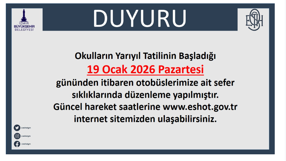 İzmir Büyükşehir Belediyesi ESHOT Genel Müdürlüğü tarafından yapılan açıklamada, okulların yarıyıl tatiline girmesi dolayısıyla toplu taşımada bazı düzenlemelerin gerçekleştirileceği ifade edildi. Açıklamada, 19 Ocak 2026 Pazartesi gününden itibaren otobüs sefer sıklıklarının güncellendiği ve şu ifadelere yer verildi: “Okulların Yarıyıl Tatilinin Başladığı 19 Ocak 2026 Pazartesi gününden itibaren otobüslerimize ait sefer sıklıklarında düzenleme yapılmıştır. Güncel hareket saatlerine www.eshot.gov.tr internet sitemizden ulaşabilirsiniz.”