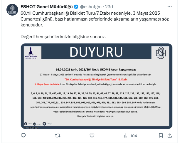 ESHOT’un duyurusunda şu ifadeler yer aldı: “60.Yıl Cumhurbaşkanlığı Bisiklet Turu/7. Etabı nedeniyle, 3 Mayıs 2025 Cumartesi günü, bazı hatlarımızda sefer aksaklıkları meydana gelebilir. Değerli hemşehrilerimizin bilgisine sunarız.” UKOME’nin 16.04.2025 tarihli 2025/304 No’lu kararına göre, 27 Nisan – 4 Mayıs 2025 tarihleri arasında düzenlenecek tur kapsamında 8. Etap, 4 Mayıs Pazar günü İzmir’de tamamlanacak. Bu kapsamda 3 Mayıs Cumartesi günü 70’ten fazla otobüs hattında aksaklık yaşanacağı bilgisi verildi.