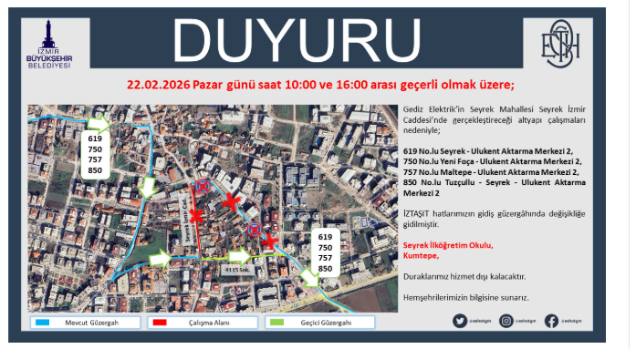 İzmir Büyükşehir Belediyesi ESHOT Genel Müdürlüğü tarafından yapılan yazılı açıklamaya göre; 22 Şubat 2026 Pazar günü saat 10.00 ile 16.00 arasında Gediz Elektrik tarafından Seyrek Mahallesi Seyrek İzmir Caddesi’nde yürütülecek altyapı çalışmaları nedeniyle bazı hatların güzergahlarında değişiklikler yapılmış durumda.