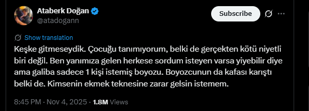 Görüntülerin sosyal medyada yayılmasının ardından Ataberk Doğan, kendi hesabından bir açıklama yaptı. Doğan, “Keşke gitmeseydik. Çocuğu tanımıyorum, belki de gerçekten kötü niyetli biri değil. Yanımıza gelen herkese sordum, isteyen varsa yiyebilir diye ama galiba sadece 1 kişi istemiş boyozu. Belki de boyozcunun kafası karıştı. Kimsenin ekmek teknesine zarar gelsin istemem,” dedi.