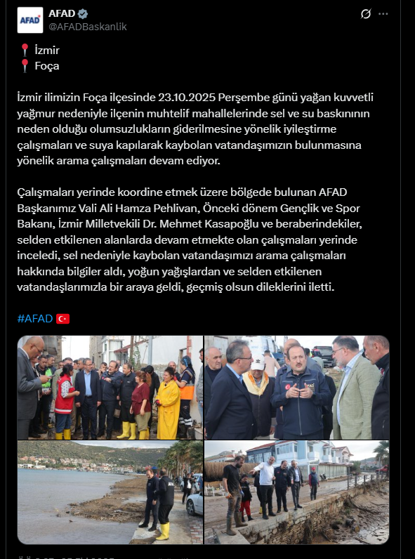Afet ve Acil Durum Yönetimi Başkanlığı (AFAD), sosyal medya hesaplarından Foça'daki durumu şu şekilde aktardı: “İzmir ilimizin Foça ilçesinde 23.10.2025 Perşembe günü yağan kuvvetli yağmur sebebiyle ilçenin farklı mahallelerinde meydana gelen sel ve su baskınlarının neden olduğu olumsuz durumların giderilmesine yönelik iyileştirme çalışmaları ve suya kapılarak kaybolan vatandaşımızın bulunmasına ilişkin arama çalışmaları sürmektedir.”