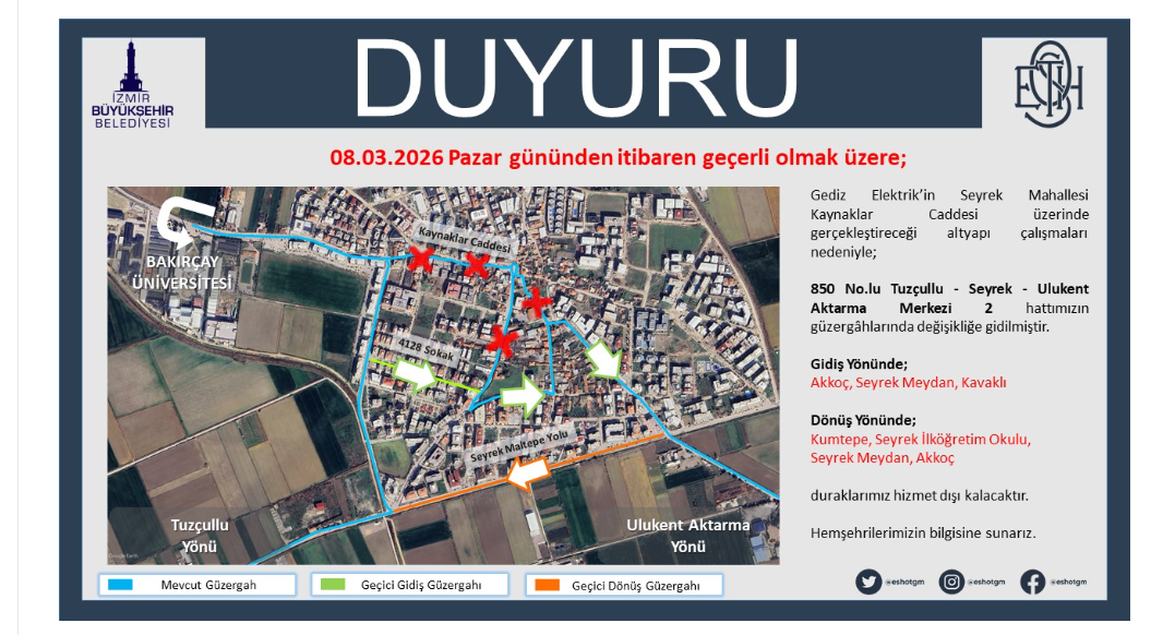 “08.03.2026 Pazar gününden itibaren geçerli olmak üzere; Gediz Elektrik'in Seyrek Mahallesi Kaynaklar Caddesi üzerinde gerçekleştireceği altyapı çalışmaları nedeniyle; 850 No.lu Tuzçullu – Seyrek – Ulukent Aktarma Merkezi 2 hattımızın güzergâhlarında değişikliğe gidilmiştir.