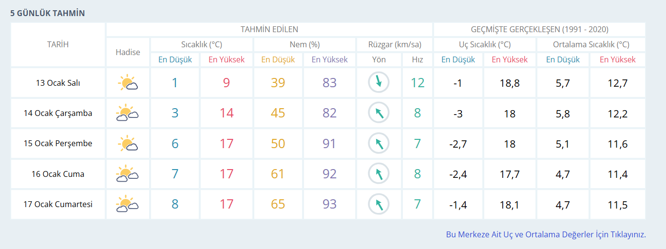 Meteoroloji'nin verilerine göre İzmir’de 13 Ocak Salı günü hava sıcaklığının 9 derece civarında olması öngörülüyor. 14 Ocak Çarşamba günü sıcaklıkların 14 dereceye yükseleceği tahmin edilirken, 15 Ocak Perşembe ve 16 Ocak Cuma günlerinde sıcaklıkların 17 derece seviyelerinde seyredeceği bildirildi. Hafta sonunda ise 17 Ocak Cumartesi günü hava sıcaklığının 17 derece civarında olacağı bekleniyor.