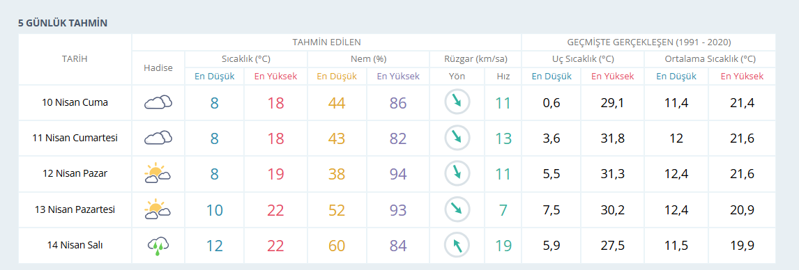 10 Nisan Cuma günü İzmir genelinde bulutlu bir hava beklenirken termometrelerin ortalama 18 derece civarında olması öngörülüyor. Hafta sonu da benzer hava koşullarının devam edeceği tahmin ediliyor. 11 Nisan Cumartesi günü sıcaklıkların yine 18 derece civarında seyretmesi ve bulutlu havanın etkisini sürdürmesi bekleniyor. 12 Nisan Pazar günü ise sıcaklıkların 19 dereceye yükselmesi ve parçalı bulutlu bir havanın hakim olması öngörülüyor.