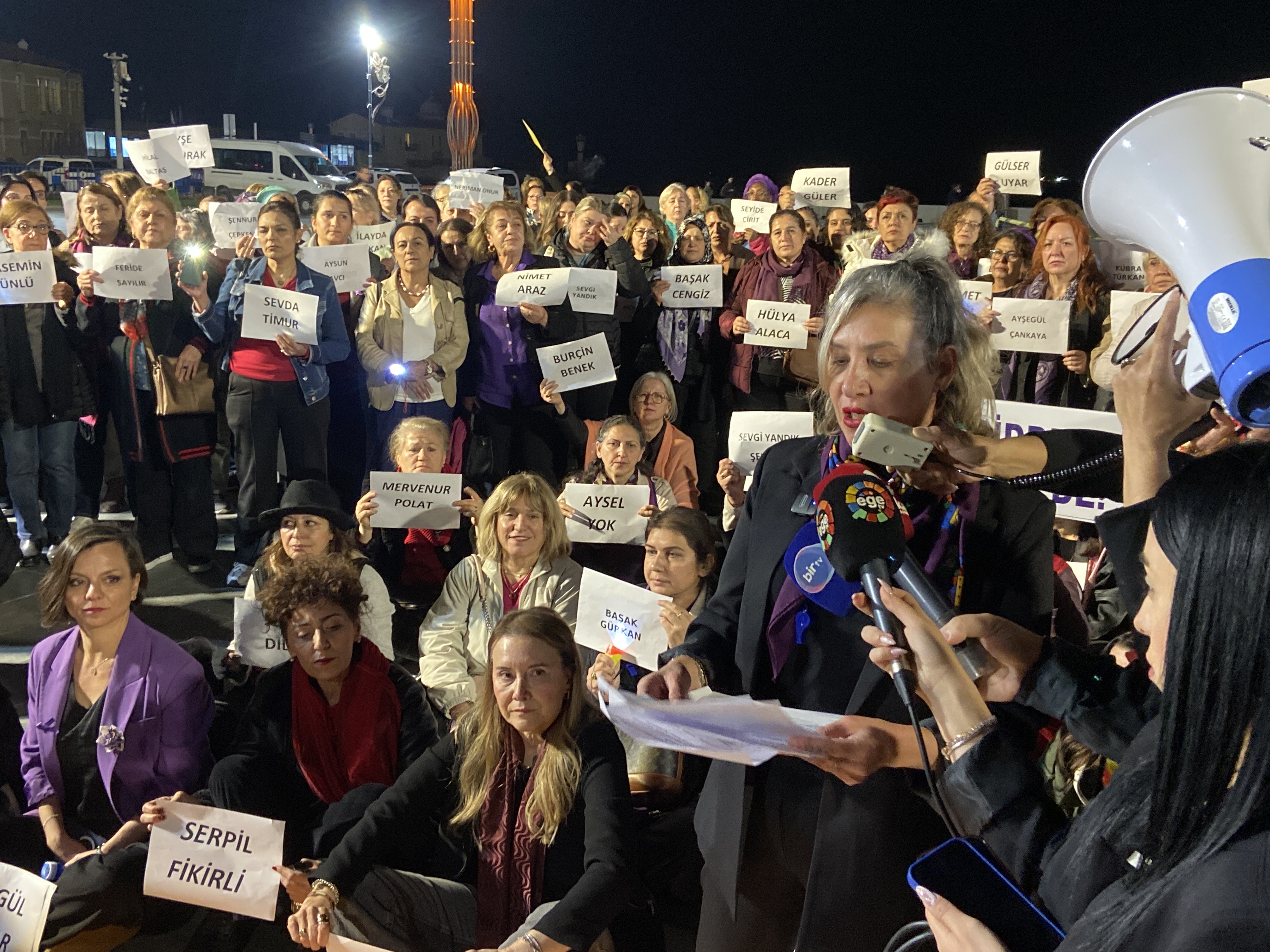 “Bugün burada sadece bir günü değil, bir dünya düzenine karşı kadınların yüzyıllardır süren isyanını konuşuyoruz. 25 Kasım, Mirabel kardeşlerden bugüne uzanan dev kadın mücadelesinin adıdır. Ve biz biliyoruz ki, bu ülkenin karanlığına rağmen kadınların dayanışması hâlâ en büyük ışık, en büyük cesarettir. OECD verilerine göre, kadına şiddette %38 ile OECD ülkeleri arasında birinci olan ülkemizde kadınlar sadece öldürülmüyor; yok sayılıyor, susturuluyor, yalnız bırakılıyor. Tecavüzler örtbas ediliyor, cinayetlere intihar süsü veriliyor, failler korunuyor. Neden? Çünkü bu düzenin sahipleri kadınları hâlâ güçsüz, hâlâ itaatkâr, hâlâ kontrol edebilecekleri bir varlık sanıyor.”