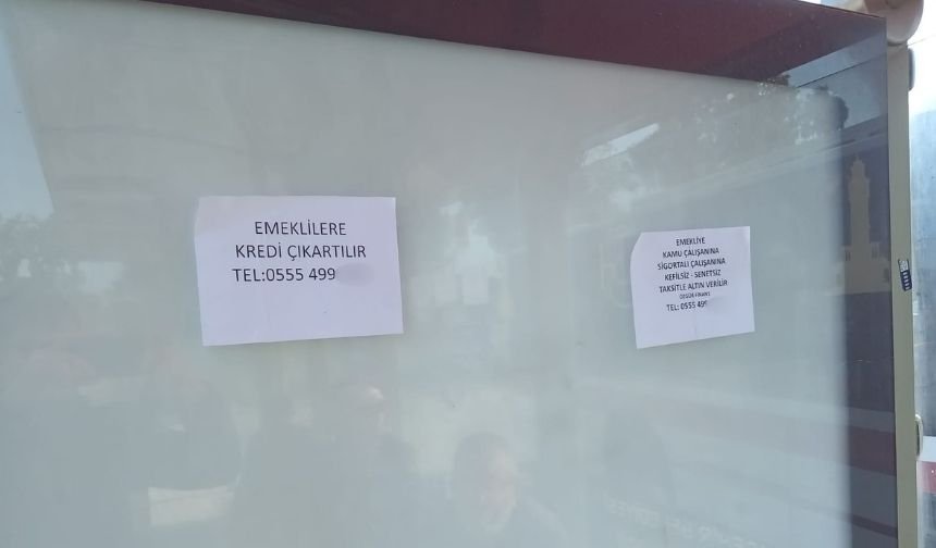 Durak camlarına yapıştırılan ilanlarda “Emekliye 16.000 ve 250.000 anında kredi”, “Kamu çalışanına, sigortalıya kefilsiz-senetsiz altın verilir” gibi ifadeler yer alıyor. Dikkat çeken detay ise ilanlarda yer alan telefon numarasının aynı olması. İlanlarda yalnızca bir GSM numarası ve “WhatsApp” ibaresi bulunurken, herhangi bir resmi kurum, şirket adresi ya da yetkili bilgisi yer almıyor.