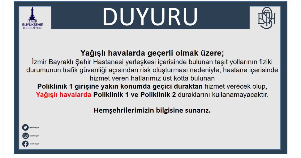 “Yağışlı havalarda geçerli olmak üzere; İzmir Bayraklı Şehir Hastanesi yerleşkesindeki taşıt yollarının durumu, trafik güvenliği açısından risk oluşturmaktadır. Bu nedenle hastane içerisinde hizmet veren hatlarımız, üst kotta bulunan Poliklinik 1 girişine yakın konumda geçici duraktan hizmet verecektir. Yağışlı havalarda Poliklinik 1 ve Poliklinik 2 durakları kullanılamayacaktır. Hemşehrilerimizin bilgisine sunarız.”