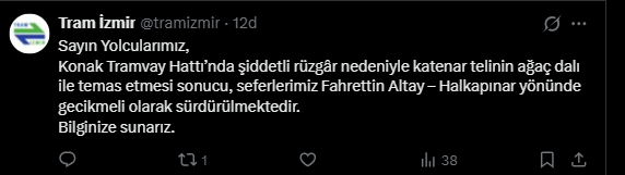 İzmir Tramvayı’nın resmi sosyal medya hesabı Tram İzmir tarafından yapılan açıklamada, şu ifadeler yer aldı: “Sayın Yolcularımız, Konak Tramvay Hattı’nda şiddetli rüzgar nedeniyle katenar telinin ağaç dalı ile temas etmesi sonucu, seferlerimiz Fahrettin Altay – Halkapınar yönünde gecikmeli olarak sürdürülmektedir. Bilgilerinize sunarız.”
