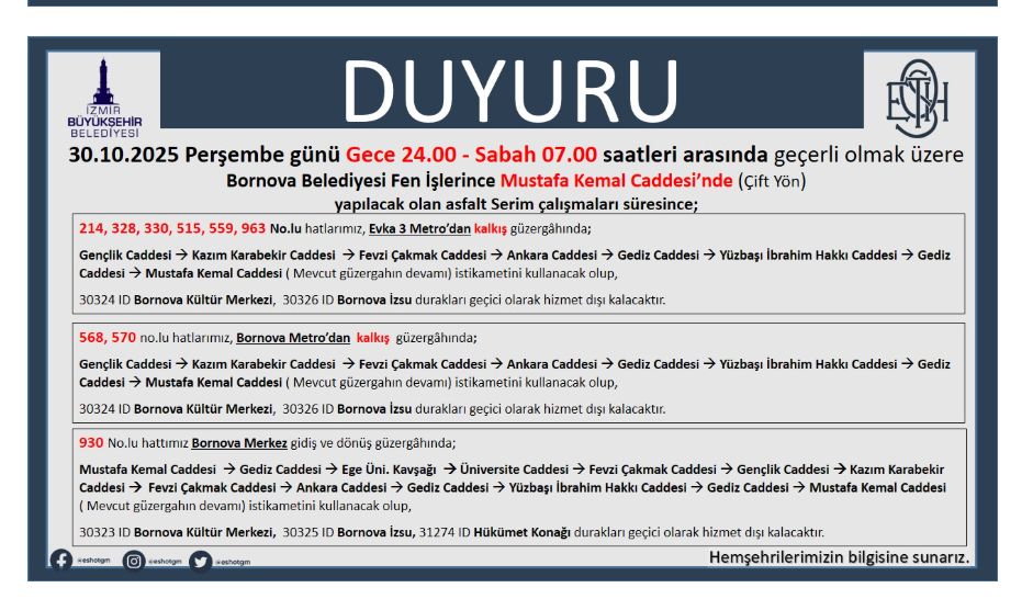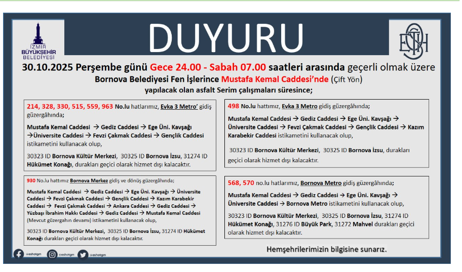 ESHOT tarafından yapılan açıklamada şu bilgiler verildi: “30.10.2025 Perşembe günü gece 24.00 – sabah 07.00 saatleri arasında, Bornova Belediyesi Fen İşlerince Mustafa Kemal Caddesi'nde (çift yön) asfalt serim çalışmaları gerçekleştirilecektir;