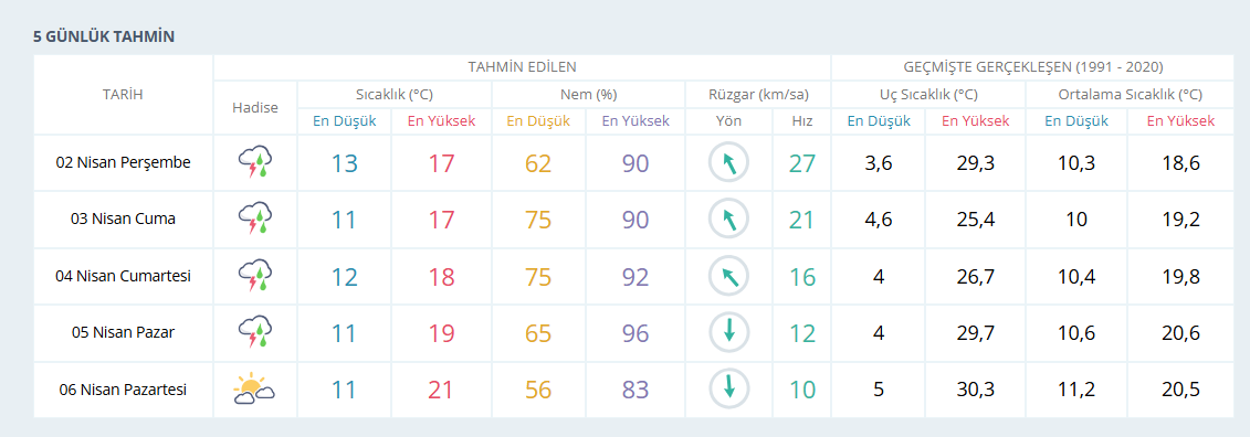 • Tire: 18°C, parçalı ve çok bulutlu, aralıklı sağanak ve gök gürültülü sağanak yağışlı
