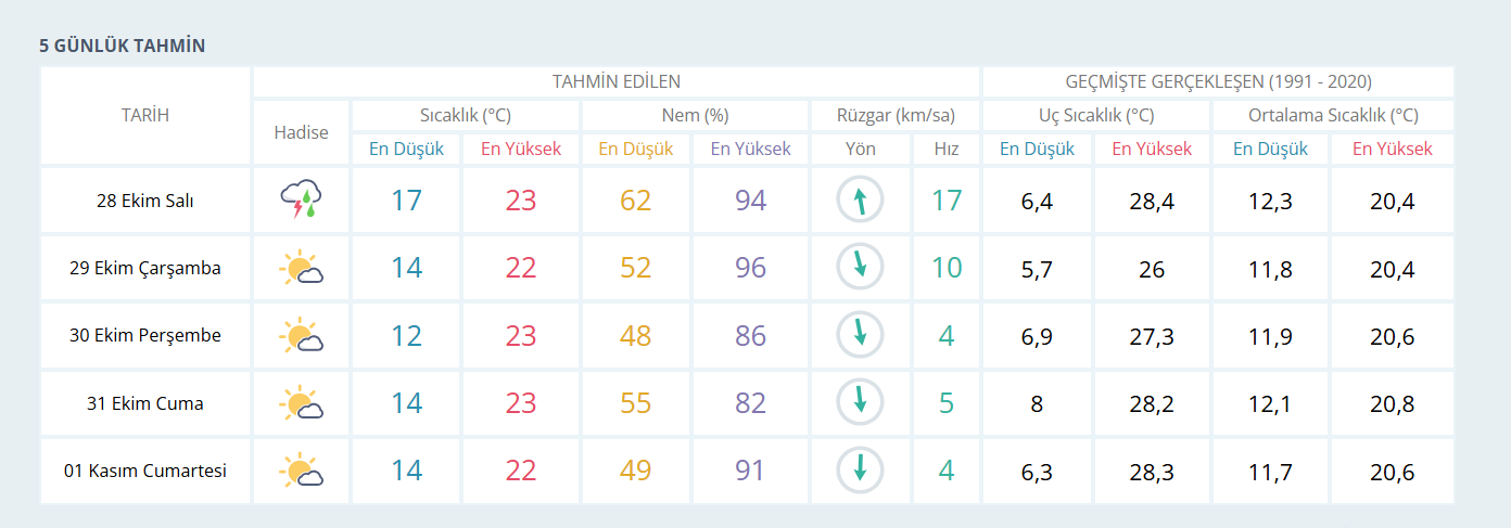 28 Ekim Salı günü İzmir genelinde gök gürültülü sağanak yağış beklenirken, sıcaklıklar 23 dereceye kadar düşecek. 29 Ekim Çarşamba günü hava sıcaklığının 22 dereceye düşmesi bekleniyor. 30 Ekim Perşembe ve 31 Ekim Cuma günleri ise hava sıcaklıklarının 23 derece civarında seyredeceği öngörülüyor.