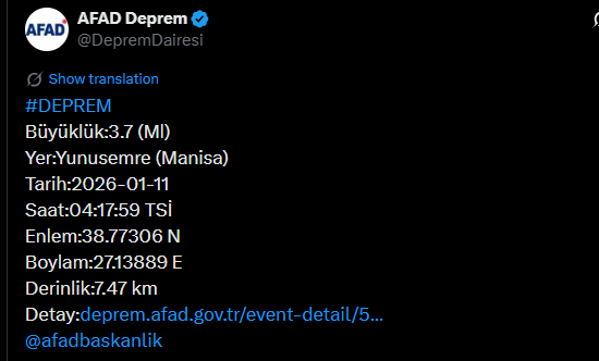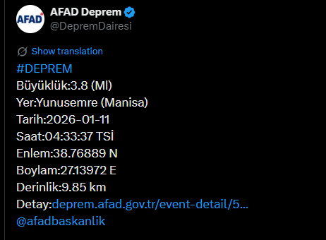 AFAD Deprem Dairesi tarafından yapılan açıklamaya göre, ilk deprem Yunusemre ilçesinde saat 04.17'de kaydedildi. 3.7 büyüklüğündeki depremin derinliği 7.47 kilometre olarak belirlendi. Bu sarsıntının hemen ardından bölgede ikinci bir deprem meydana geldi.
