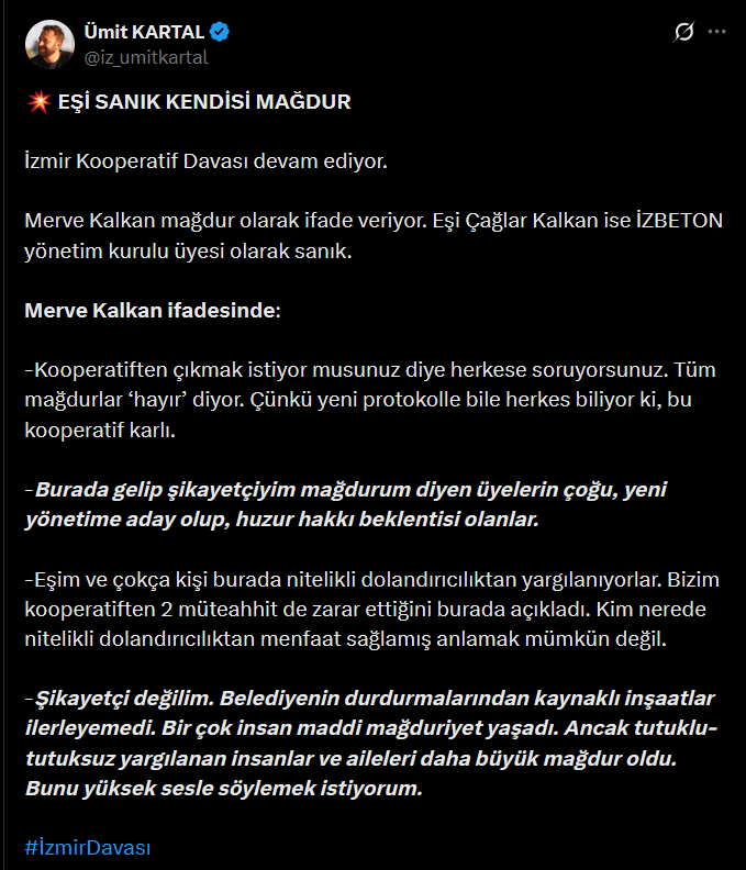 Merve Kalkan, İzmir Kooperatif Davası'nda mağdur olarak ifade verirken, eşi Çağlar Kalkan'ın İZBETON yönetim kurulu üyesi olarak sanık konumunda olduğunu belirtti.