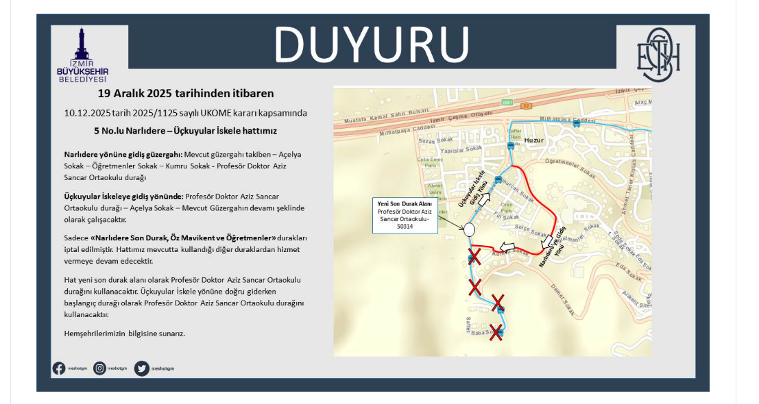 İzmir Büyükşehir Belediyesi ESHOT Genel Müdürlüğü, konuyla ilgili şu bilgileri paylaştı: “ 19 Aralık 2025 tarihinden itibaren 5 No.lu Narlıdere – Üçkuyular İskele hattı Narlıdere yönüne gidiş güzergahı: Mevcut güzergahı takiben – Açelya Sokak – Öğretmenler Sokak – Kumru Sokak – Profesör Doktor Aziz Sancar Ortaokulu durağı