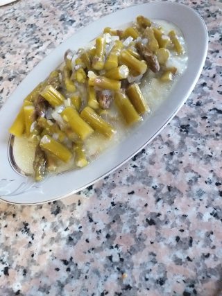 Yemeklik doğranan soğanlar zeytinyağında pembeleşene kadar kavrulmakta. Ardından elle kırılan kuşkonmazlar eklenip birkaç dakika soteleniyor. Üzerine bir miktar su ilave edilerek kuşkonmazlar yumuşayana kadar pişiriliyor. Ayrı bir kapta un, sirke ve tuz karıştırılarak yemeğe ekleniyor. Birkaç dakika daha karıştırıldıktan sonra ocaktan alınıyor. İsteğe bağlı olarak üzerine yumurta kırılarak sıcak olarak servis yapılıyor.