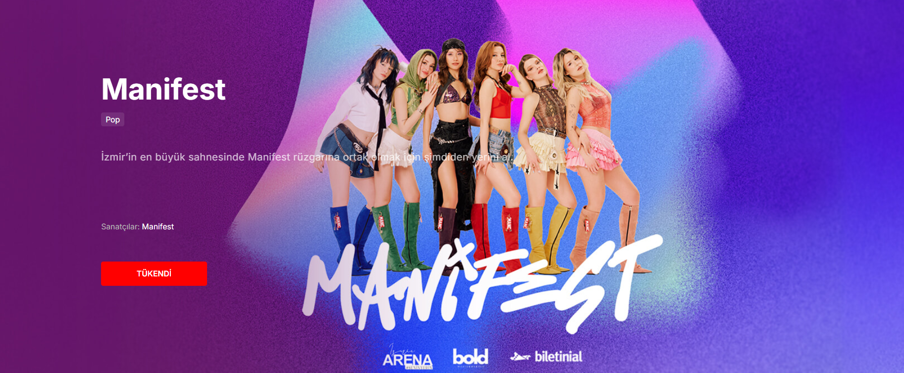 İzmir'in en popüler etkinlik alanlarından İzmir Arena, 3 Mayıs 2026 Pazar günü Manifest konserine ev sahipliği yapacak. Etkinlik takvimine yapılan duyurunun ardından konsere yönelik büyük bir ilgi oluştu ve satışa sunulan biletler kısa sürede tamamen tükendi. Organizasyonun açıklanmasıyla beraber meydana gelen yoğun talep, bilet satışlarına direkt olarak yansıdı.