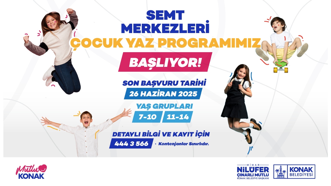 Konak Belediyesi tarafından düzenlenen Çocuk Yaz Programı, 30 Haziran’da başlayacak. Etkinlikler, Ballıkuyu, Gültepe, Aziziye Semt Merkezleri, Toros ve Beştepeler Sosyal Tesisleri ile Mersinli Kurs Merkezi’nde gerçekleştirilecek. Tüm etkinlikler, 7-10 ve 11-14 yaş gruplarına özel olarak tasarlandı.