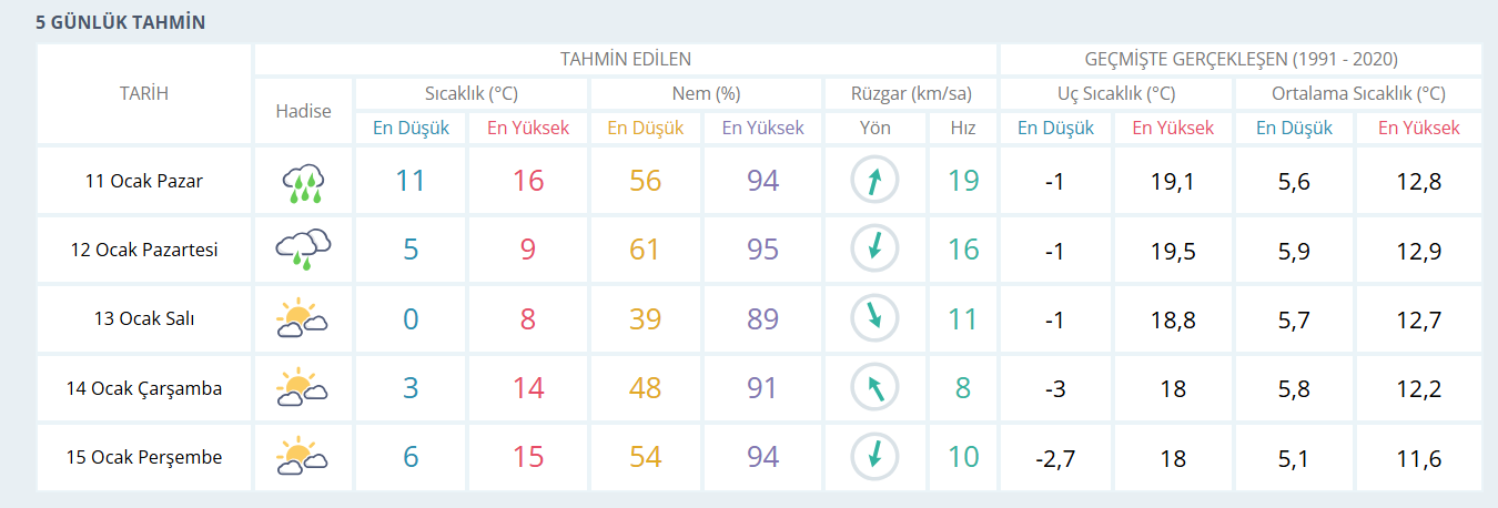12 Ocak Pazartesi günü hava sıcaklığının 9 dereceye kadar düşmesi ve sağanak yağışların devam etmesi bekleniyor. 13 Ocak Salı günü sıcaklığın 8 dereceye gerilemesine rağmen, yağışlı havanın etkisini kaybetmesi öngörülüyor. Salı gününden itibaren hafta boyunca parçalı bulutlu bir hava beklenirken, yağış olasılığı bulunmuyor.