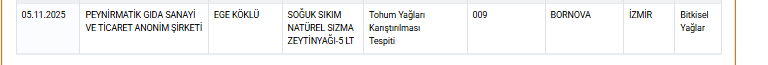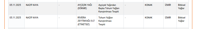 Tarım ve Orman Bakanlığı'nın açıkladığı güncel listede İzmir'in Konak ve Bornova ilçelerinde faaliyette bulunan iki firmanın ürünleri dikkat çekti. Konak'taki NAZIF KAYA firmasına ait AYÇİÇEK YAĞI (DÖKME) ürününde ayçiçek yağının yanı sıra tohum yağları karıştırıldığı belirlendi.