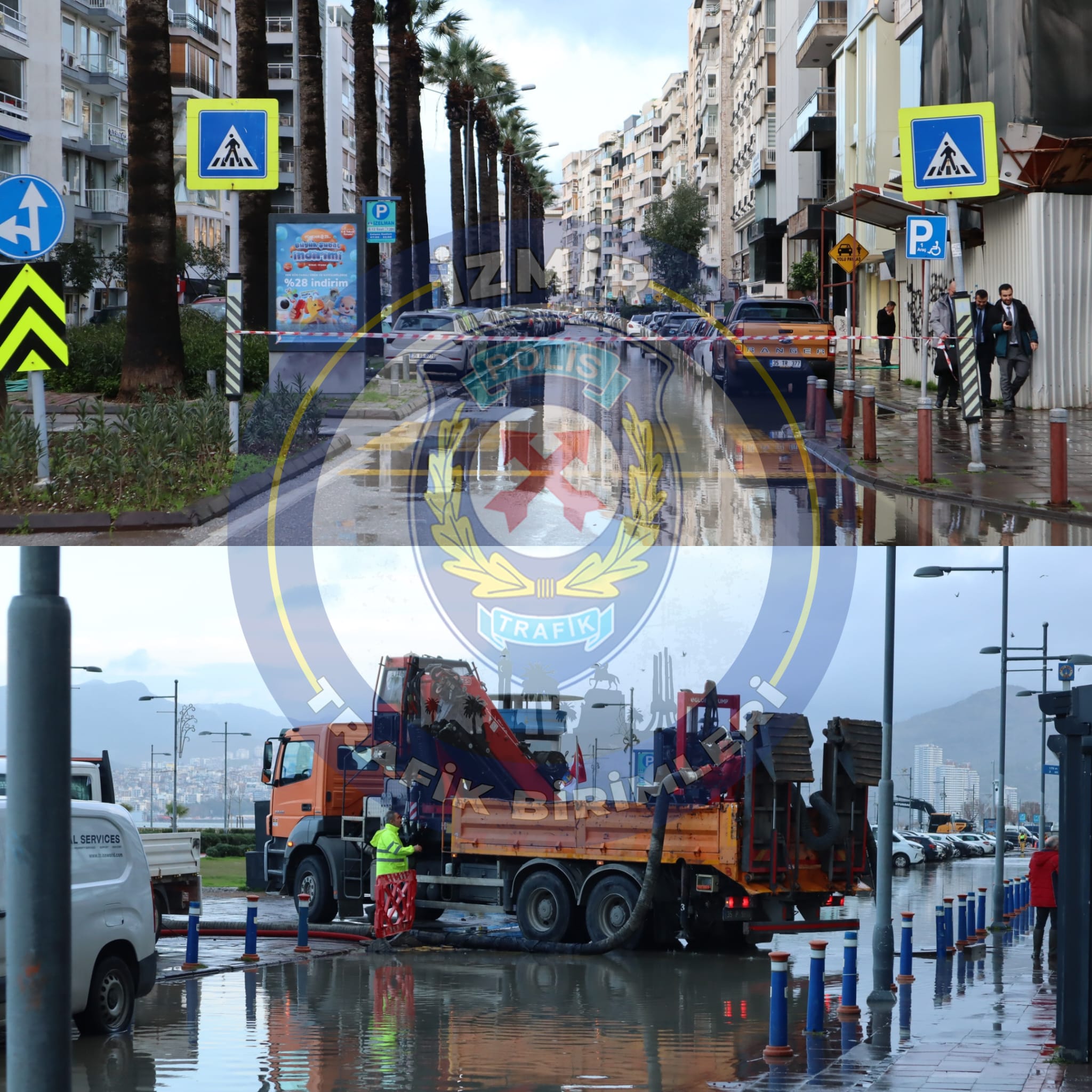 İzmir Emniyet Müdürlüğü açıklamasında şu ifadelere yer verildi: “İlimizdeki yoğun yağışlar sebebiyle Atatürk Caddesi 1. Kordon 1479 sokak kesişimi ile Gündoğdu Meydanı arası ve Gündoğdu Meydanı ile Cumhuriyet Bulvarı kesişimi geçici süreliğine trafiğe kapatılmıştır. Bu güzergahı kullanacak olan sayın yol kullanıcılarımızın bilgisine sunarız.”